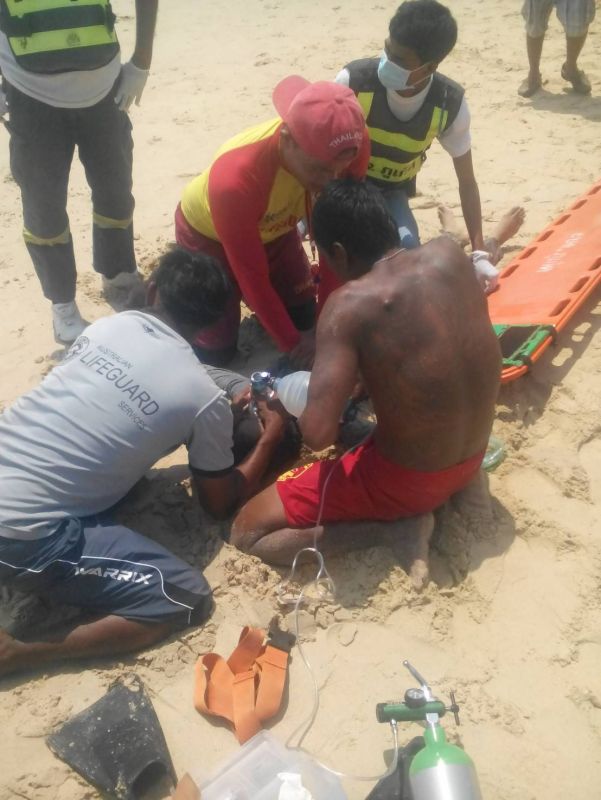 Около 13:30 в воскресенье в муниципальное подразделение по предотвращению ЧС поступило сообщение о том, что шесть человек, купавшихся на пляже Най Харн, унесло в море отбойным течением. Очевидцы испугались, что ребята могут утонуть. Поэтому отважные спасатели с пляжа отправились вызволять из воды четырех молодых людей и двух девушек.