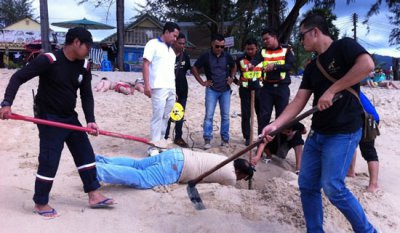 работы на пляжеПХУКЕТ:- Администрация округа Камала подтвердили, что они удалили семь ржавых стальных стержней, которые были похоронены в песок на пляже Камала.