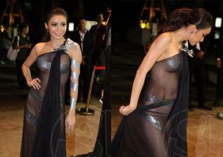 На днях на церемонии вручения премий Siam Dara модель журнала Maxim вызвала небольшой всплеск негатива тем, что появилась в «наряде» из липкой ленты и прозрачной ткани. Вероятно, она надеялась произвести бурное впечатление.